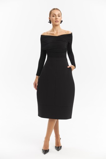 The Bud skirt is cut from structured stretch fabric that sculpts the waist and softens into a cocoon-like midi shape. Its clean construction and concealed zipper emphasize a seamless line, creating quiet volume and natural movement. Pair it with our Body Top.